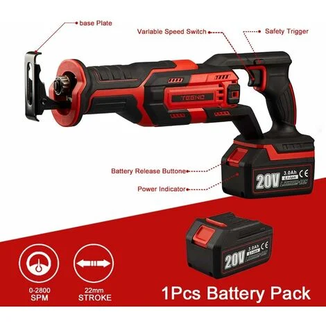 Scie Sabre sans fil TEENO,20V Scie Sabre à Batterie, Scie Egoîne Electrique sans Fil, 5×Lames de Scie, Avec 3Ah Batteries,Boite en plastique
